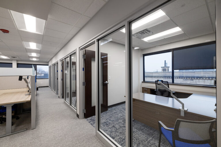 Ancon Building Services (ABS) recently completed an interior remodel of the 2nd and 3rd-floor office space in downtown Elkhart. The project involved extensive demolition and the installation of new walls, ceilings, lighting, flooring, aluminum and hollow metal door frames, doors, casework, and more.