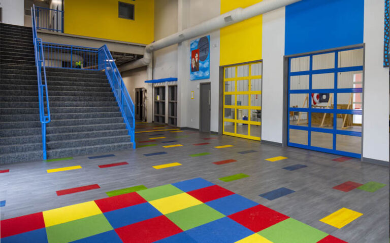 We designed and renovated 60,000 square feet, two floors, and added 32,000 square feet to an existing Bayer building. The total project was approximately 6 million. An excellent example of combining the renovation of a 50+-year-old building with a new construction addition to blend the past with the future. The use of bold colors and movable glass walls allows for building flexibility, whether for teaching or for a robotics competition.