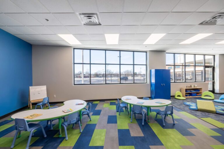 The design maximizes the building’s existing 25’x25’ column spacing, incorporating classrooms, training rooms, conference rooms, and office spaces. A central student lounge, illuminated by multiple skylights, brings natural light into the heart of the building. A large interior window system creates transparency and clear sightlines between spaces. The design also features vibrant wall colors, floor patterns, and intricately detailed ceiling elements.
