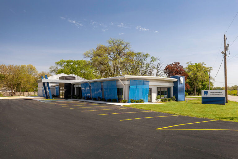 Ancon Construction successfully designed and renovated the interior and exterior of the building located at 14911 SR 23, Granger, to create a new home for Granger Dental and Orthodontics. The challenge was to repurpose a former classic car dealership and transform it into a state-of-the-art dental practice. By incorporating several architectural wall panels and decorative screens, a uniform and modern look was created across the entire façade. A vertical element, signage, and angled entry canopy were also added to give the building a new architectural identity. The 6,700 square foot facility includes ten general dentistry treatment rooms and ten orthodontic suites.
