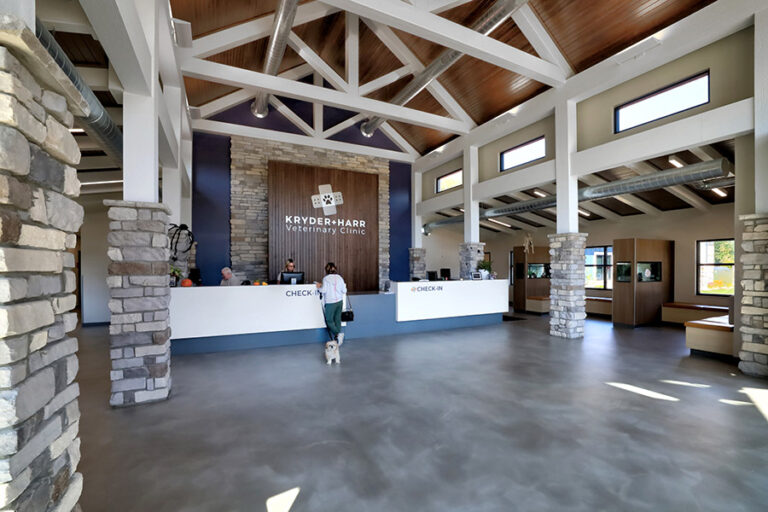 Kryder + Harr Veterinary Clinic is a state-of-the-art new facility in Granger, Indiana. The Integrated Design-Build™ project consists of a spacious lobby with fish tanks, an expanded check-in and check-out desk, canine suites, observation rooms, dental treatment, surgery, x-ray, ten exam rooms, behavior, employee workspaces, and lounge, and storage.