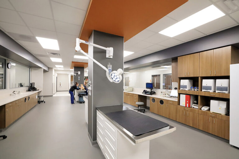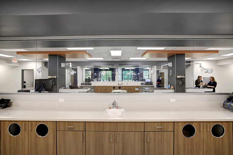 Kryder + Harr Veterinary Clinic is a state-of-the-art new facility in Granger, Indiana. The Integrated Design-Build™ project consists of a spacious lobby with fish tanks, an expanded check-in and check-out desk, canine suites, observation rooms, dental treatment, surgery, x-ray, ten exam rooms, behavior, employee workspaces, and lounge, and storage.