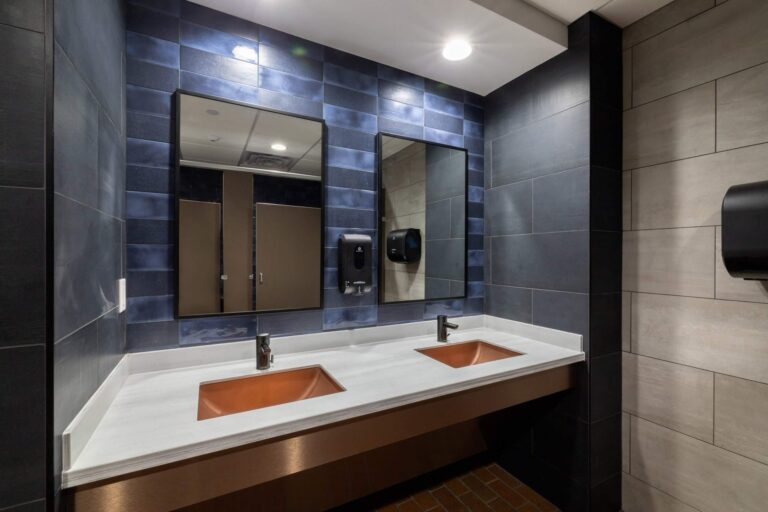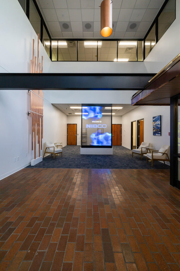 Ancon Building Services (ABS) recently transformed NIBCO’s World Headquarters main entrance lobby, giving it a sleek, modern update that embodies the company’s forward-thinking vision. The renovation included a revitalized main entrance, restrooms, conference rooms, and lobby areas. The newly designed lobby features views of the courtyard’s clock tower and a cutting-edge hologram wall that personalizes greetings for visitors — perfectly reflecting NIBCO‘s commitment to being ahead of the flow.