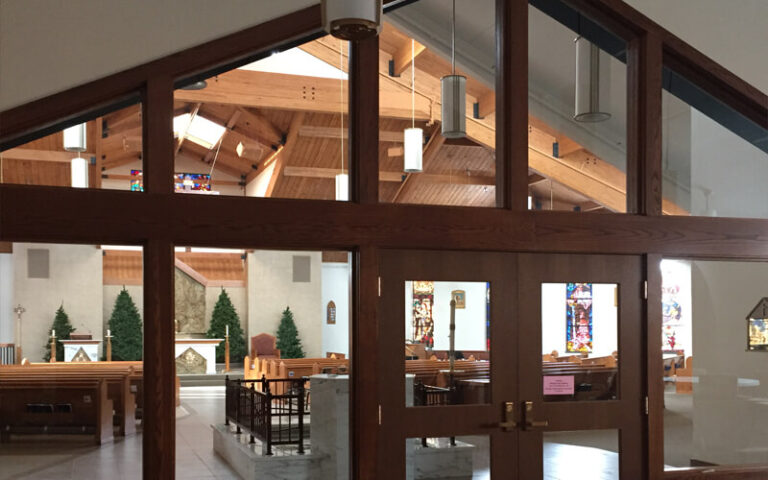 A 5,400 square foot sanctuary features elaborate timber truss construction, stained glass windows, custom-built pews, and an ornate baptismal fountain.