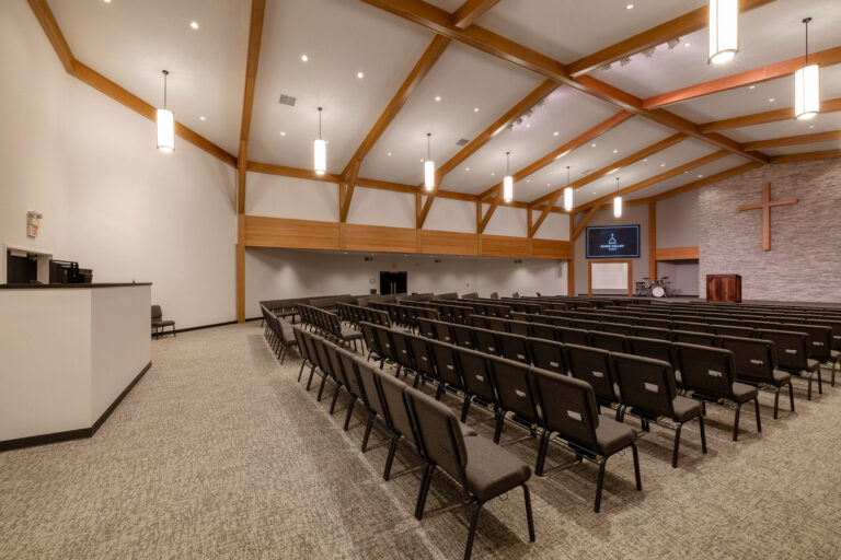 A unique challenge was the building’s original “pole barn” construction, which required thoughtful detailing to achieve the desired architectural character. Over six months, the vision came to life. With faux wood beams, stone elements, and a centrally featured cross, the completed Worship Center reflects its design intent, a space that is truly “Here to Stay.”