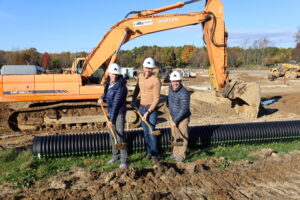 Groundbreaking, left to right: Jeff Showalter, First State Bank, Jim Neff, First State Bank, Amber Wolfer, Lake City Bank, Steve Brenneman, Aluminum Insights, Niles Graber Alvarez, Aluminum Insights, Jeff Miller, Aluminum Insights, Larry Siegel, Syracuse Town Council President, Sean Welty, Ancon Construction, Joe Honkomp, Aluminum Insights, Doug VonGunten, Ancon Construction, Ben King, Ancon Construction.